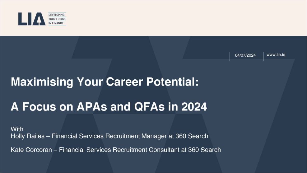 Watch below our webinar in collaboration with 360 Search. Recruitment specialists, Holly Railes and Kate Corcoran shared their thoughts about what the job market in Ireland looks like for those who have obtained the APA and QFA designations, the diverse career opportunities available and recruitment insights.